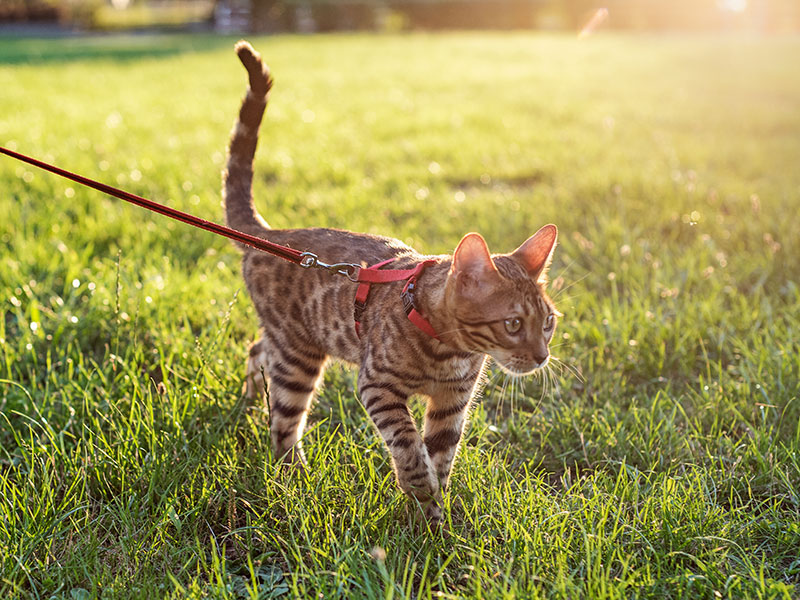 Walking is a great time to work on training. If you are new to walking, trying to introduce training right away might be a bit too much for your pet, so take it slow and work on one thing at a time. Familiarizing your pets regularly with crosswalks and high-traffic areas such as schools and parking lots can be a great training tool for a high-strung dog to learn about its surroundings and work on keeping them calm. Start with something simple like getting your dog to sit when you are waiting for the crosswalk light to turn, or getting your cat to give you their attention. Remember if you are just starting, that good things don’t happen overnight. It can take a while to get your pet to where you want them to be on walks, but consistency is key, so make sure you follow through and good things will therefore follow.